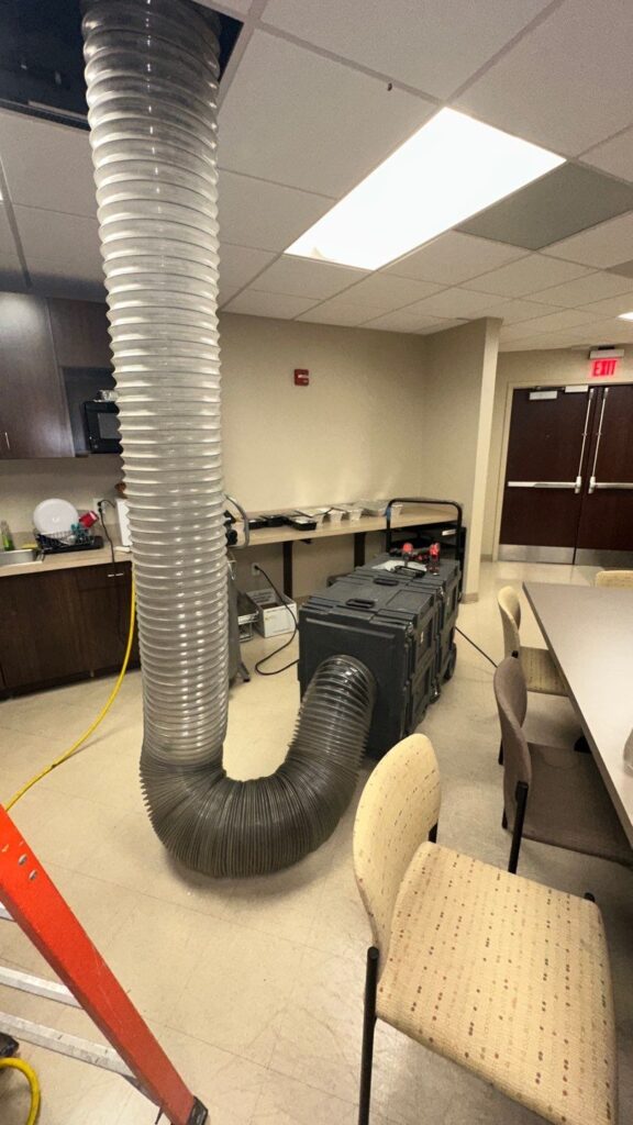Work areas are isolated with physical barriers and kept under negative pressure with HEPA filtration to capture dislodged material. Crews follow infection-control protocols and PPE requirements, and air quality is checked before turnover.